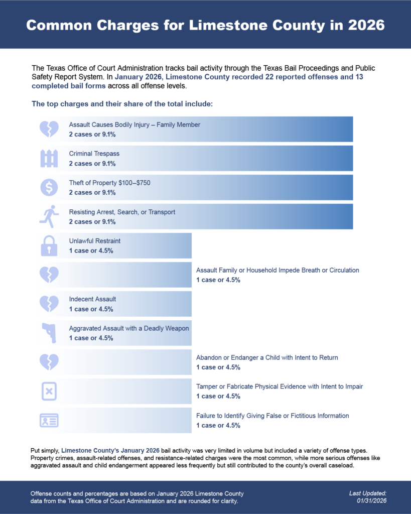 Bail bonds in Limestone County, Texas may include felony bail bonds, misdemeanor bail bonds, and DWI bail bonds, depending on the charge and court requirements.