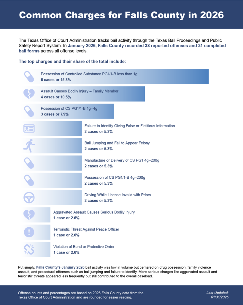 Bail bonds in Falls County, Texas may include felony bail bonds, misdemeanor bail bonds, and DWI bail bonds, depending on the charge and court requirements.