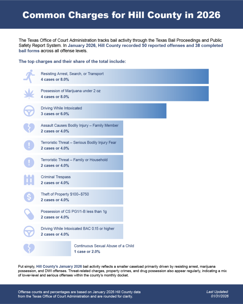 Bail bonds in Hill County, Texas may include felony bail bonds, misdemeanor bail bonds, and DWI bail bonds, depending on the charge and court requirements.