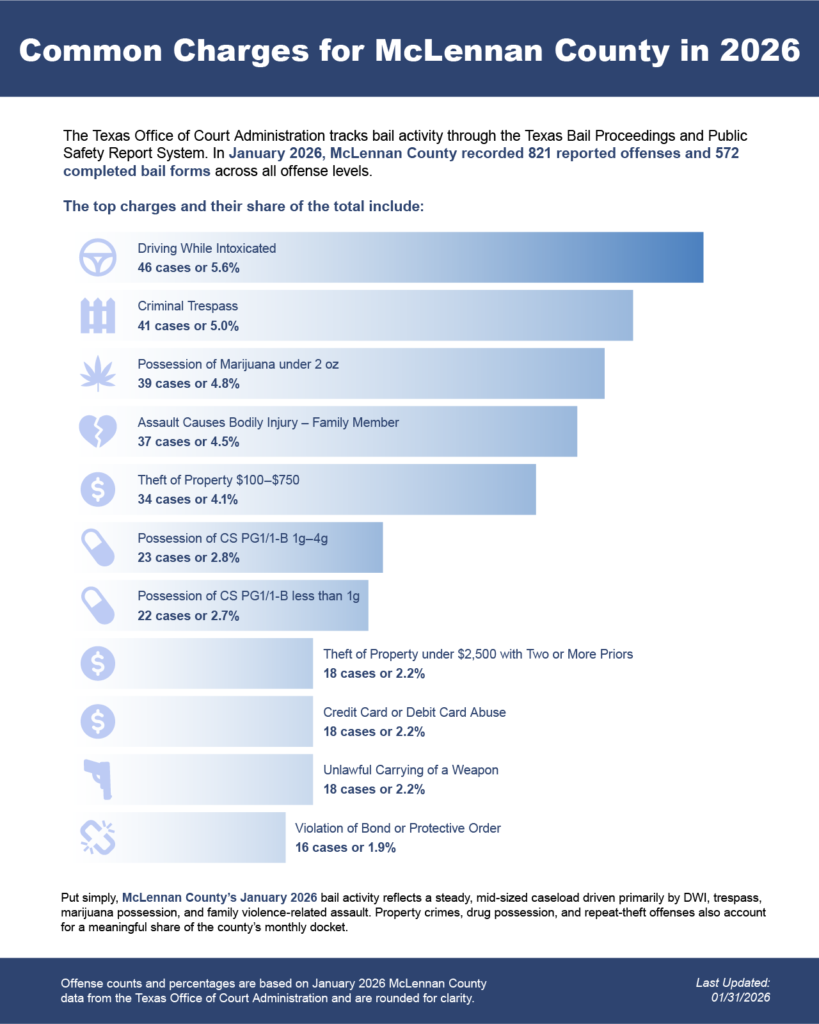 Bail bonds in McLennan County, Texas may include felony bail bonds, misdemeanor bail bonds, and DWI bail bonds, depending on the charge and court requirements.